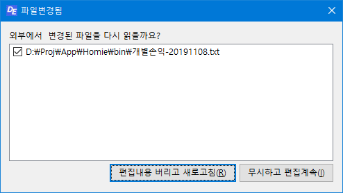 외부에서 파일내용이 변경되었을때 감지창 한글깨짐 수정.