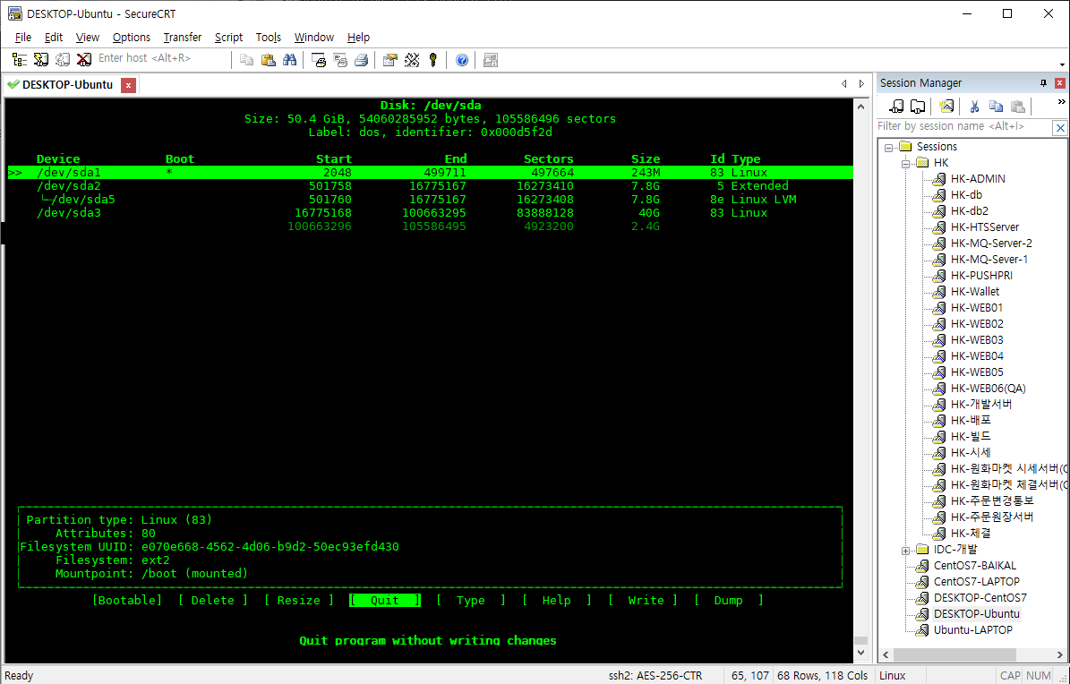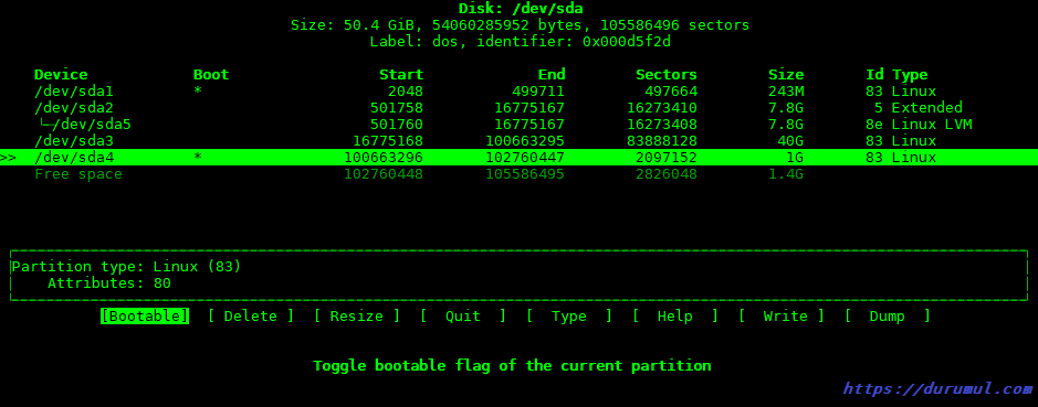 [Bootable] [ Delete ] [ Resize ] [ Quit ] [ Type ] [ Help ] [ Write ] [ Dump ]