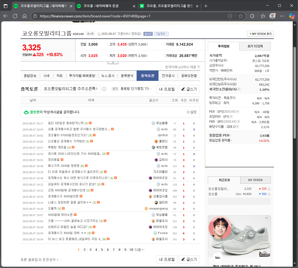 종토방 바로가기: 코오롱모빌리티그룹 : 네이버페이 증권