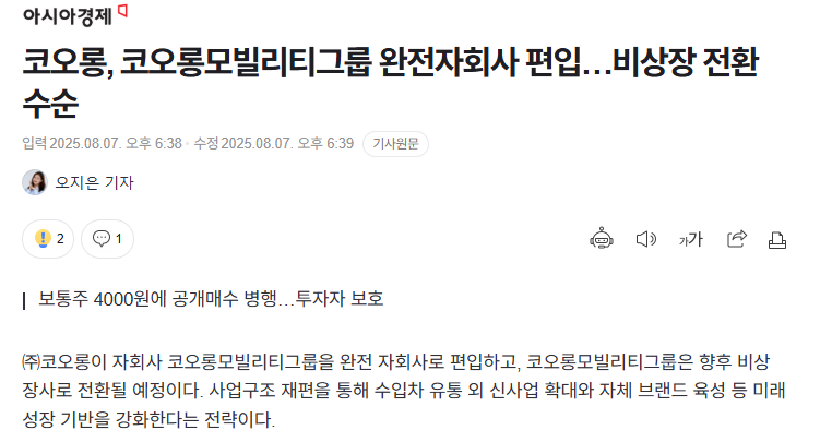 기사원문: 코오롱, 코오롱모빌리티그룹 완전자회사 편입…비상장 전환 수순