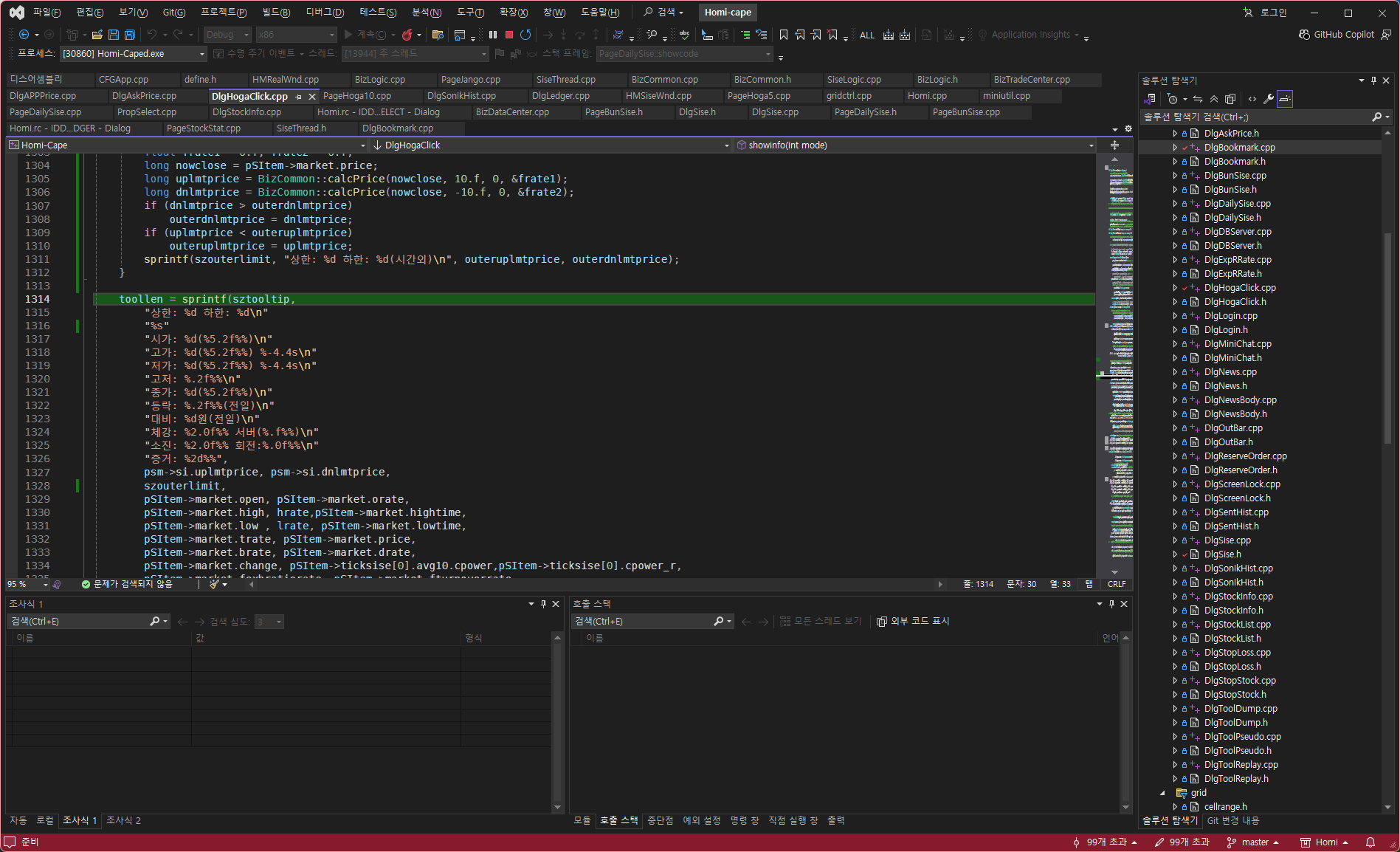 | n if (pFItem->ask_on != -1) pFItem->ask_on = -1; else if (pFItem->ask_on == -1) pFItem->ask_on = -2; else if (pFItem->ask_on == -2) pFItem->ask_on = 0; 347700 매도41 하락세 왜 안먹힘 케이프만 매수정정 1칸이상 x 풀기 stop 중간가 잔상잇음 호가정정 간격 x 팝업메뉴 매수틱-1 1502137|326 H S:0214 R:0213 340360 다보링크 등락: 1647( -1.44%) 거래량: 666643( 0.00%) 틱강: 31R/1464T/16046B 틱추세:3 ( 33),TM:+++++|+++++ rc=09 체결틱1 1502138|327 H S:0214 R:0213 064350 현대로템 등락:116000( 9.85%) 거래량: 1695846( 0.00%) 틱강: 54R/760T/413B 틱추세:2 ( 3),TM:+++-+|++-+- rc=09 매수틱-1 1503138|330 H S:0314 R:0313 094480 갤럭시아 등락: 8190( 0.37%) 거래량: 361522( 0.00%) 틱강: 42R/154T/ 0B 틱추세:0 ( -1),TM:-++++| + + rc=0A 체강154% 1503138|331 H S:0314 R:0313 071090 하이스틸 등락: 5050( 0.20%) 거래량: 3450494( 0.00%) 틱강: 40R/349T/1303B 틱추세:1 ( 1),TM:+-+++| -+ rc=09 체결틱1 v10 추가 장마감후 매수취소 잔고 0.5 없애기 가중치창 값개선 잔고 추매시 평단병경로그 툴팁 일없애고 시분만표시 손주문tr표시 뉴스에 필터링 왜안됌? 호가창 일버튼에 투동표시(F,P) 시간외시세수신종목표시 추세등락토글은 시세수신시에만 미싱목록 종목코드 시간 내용 1.0;1.2;1.4;1.6;1.8;2.0;2.5;3.0;0.3;0.5;0.8; 체강보정 수량적을때 비율줄이기 2.0이상에 안됨 요동2에도 사 호가창스크럴 손절 checkDailySise 마지막한번만하기 if (g_pMainWnd && ::IsWindow(g_pMainWnd->GetSafeHwnd())) { g_pMainWnd->m_pFrmLedger->m_pDlgLedger->RefreshOrderLedger(); } pFItem = g_datacenter.m_jangoledger.GetItem(shtcode); if (pFItem) { } 스톱로스팝업설정 pFItem->psi 매수조건(보조지표,체강,틱추이,매수세) 중 2개 만족하면 무조건 매수하기(점수제) 1.0세팅 초기 스톱로스 설정값대로-2로? f3,f9 정정2번내로 두번정정말고 +2말고 새매수로 1번만? 무조건많이사고 빨리손절 ask_on = 0,1만되게 정리(임시중지) 전일종가의 손익금 표시 마우스대면 손익율보이기 08시 고정 pstoploss->settime 매도시간지연조정 호가변동에 자동 따라가며 스톱로스(매도9에 하이,매수9에 로우걸기) 이벤트수신안에서 Sleep 문구없애기 매수정정시 스톱로스 상하향 손매수시 분체강검사 매수통과를 점수제로(수익율,체강,체결틱수,매수틱수등) 전부만족안해도 총점 평균 80이상시 통과 호가창 등락율0%에 손익금 표시 매수스킵목록 최근50개 상황판 표시 체결,호가 시세수동저장 LS NXT거래소 주문작동테스트 -미지원 오후 7:53 2025-04-25 매수회피 전체 토글(on/off) SkipBid에 모든 매수회피 하위xml등록 tempstr = xu.GetTextElement(node, "ExceptFilter"); //if (tempstr.GetLength() > 0) strncpy(this->setting.szExceptFilter, tempstr, sizeof(this->setting.szExceptFilter) - 1); this->setting.bUseExceptFilter = xu.GetElementAttributeInt(node, "ExceptFilter", "use", this->setting.bUseExceptFilter); bBidSkipBadHoga,nBidSkipAvgMask등로직정리 커멘드창 stopall stopbid showjango showorder 등 비즈로직바꾸기 장초변동없앰 bBidSkipOpen IDC_CHECK_BIDSKIPVOLATILITY fBidSkipOpenRate IDC_CHECK_BIDOPENRATE bBidSkipOpenRate IDC_EDIT_BIDMAXOPENRATE IDC_COMBO_BIDSKIPHIGHRISK ↑↓ t일때 매도불량 틱추이 구할때 현재시간과 비교 노노 매도는 틱이나 호가수신시 수행 수신안될땐 모니터링에서. 매수시점 매도시점 재분석 깡패모드 수익율만족하면 무조건산다(나머지 조건무시) 3호가이상밀리면 무조건 3호가로 3번 매도정정한다 3번넘어서도 안되면 1호가로 매도정정 손절한다. 틱추이 현재가 중간 40번째비교 하향세판단 txt를 SQLite db로 보조지표에 틱체결 소진율추가 주식 소진율 = 외국인의 보유율인데 난 여기서 소비율을말함 Slack활용 알림제공 SQLite HMRealWnd에 쓰레드개설해서 아이들상태 잔고나 주문중인 것 취소 [증권사 api 추천] 1. 모니터링용 증권사 api : 대신 증권 또는 키움증권의 api를 추천한다 2. 매매용 증권사 api 별다른 조건이 필요 없다. 증권사 수수료가 싼 게 최고다. 가격보정:5600 C 100222:5600→4505,76 4490,1=4510,140 4505,265 -19.70% +3 C5 OK:0 X 095358:1093→1099,260 1093,363=1100,1443 1100,10 0.37% 9 NG:22 제한↑ X 095448:1097→1099,520 1096,4025=1100,5014 1100,736 0.00% 4 NG:22 제한↑ X 095619:1090→1090,520 1089,4651=1091,983 1090,82 -0.18% 4 NG:22 제한↑ X 095650:1092→1098,520 1093,115=1098,29 1098,898 0.37% 3 NG:22 제한↑ X 100027:1085→1094,520 1087,13=1095,3229 1095,2872 0.65% 3 NG:22 제한↑ O 100901:1127→1135,500 1129,30=1136,7981 1136,2239 0.53% +3 H OK:0 X 100901:1130→1135,500 1130,166=1136,7981 1136,2239 0.26% 3 NG:15 수익0.26% X 100922:1110→1116,310 1114,403=1115,2 1114,500 0.36% 5 NG:15 수익0.27% X 101108:1100→1103,320 1100,196=1104,824 1103,735 0.09% 5 NG:15 수익0.09% X 101219:1099→1100,320 1099,499=1100,64 1099,233 -0.09% 7 NG:22 제한↑ X 101302:1092→1099,520 1092,993=1098,12 1099,18 0.46% 3 NG:22 제한↑ 거래증가율 psm->ds.days[0].diff_vol = BizLogic::calcDrate(psm->ds.days[1].volume, psm->ds.days[0].volume); 매수직후 5호가밀리면 매도칼절 물타기 잔고 50%미만시 추가매수 호가창에 전일투매표시 취소겁나안되는거 억표시 밑에 매수가0이하 매수정시 스톱보정 무조건이익나면매도 실손분석 매수3호가이고 공백많으면 취소. 내앞에 수량더크면 취소나 1칸정정 IDC_COMBO_BIDSKIPBLANK 매수3호가위가 내수량넘으면 취소 8평균저장x 매수예약기능 >이거나 < 지정가 이면 시세에 매수 권리락 왜사냐 등락율 구간한개더 %까지 5평균이면 이전 5평균 ticksise[5] 비교( 나보다 크면 매수안함) 종